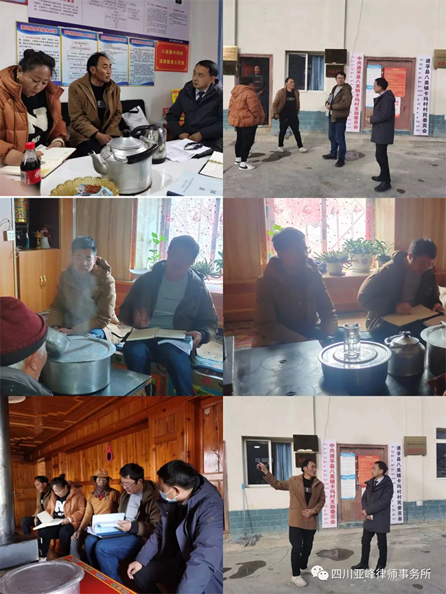 亚峰(道孚)分所组建于2021年5月,分所建成伊始就全面承担了覆盖道孚县域所有乡镇的法律顾问工作,面对全县各村分布偏远且经济欠发达的实情,分所继而于2022年6月以免费签约的方式,与全县118个乡村初步搭建起村(居)法律顾问网络构架。为更好满足道孚县广大村民群众日益增长的法律服务需求,分所律师持续作为,率先探索,通过创新网上线下“双线行动”工作模式,靠前服务,以乡村级法律顾问直通车方式,力图更好发挥法律规范在乡村管理中的指引作用。