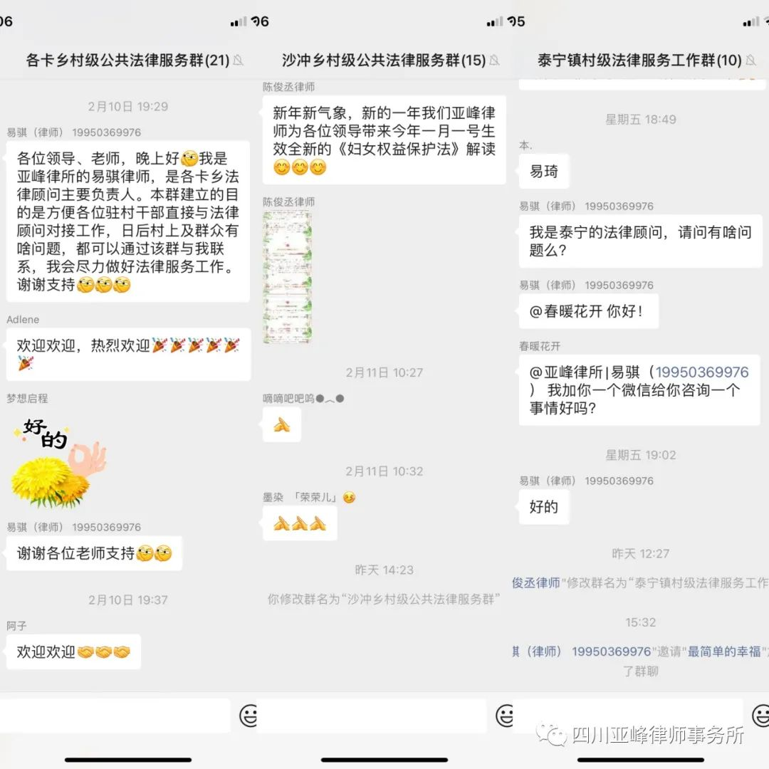 以微信群全覆盖方式构建“镇村+两所”法律服务网络。亚峰(道孚)分所与道孚县各乡镇司法所分别建立各乡镇、村级微信群,其中包括有乡镇领导、政法委员、 包村干部、 村委干部等工作人员。群众有任何法律需求,通过在微信法律顾问群中提出,为基层群众提供普惠性、公益性、见效快、可选择的公共法律服务。真正将法律服务送到群众身边,实现群众足不出户就能获得精准、全方位、高效便捷的法律服务。